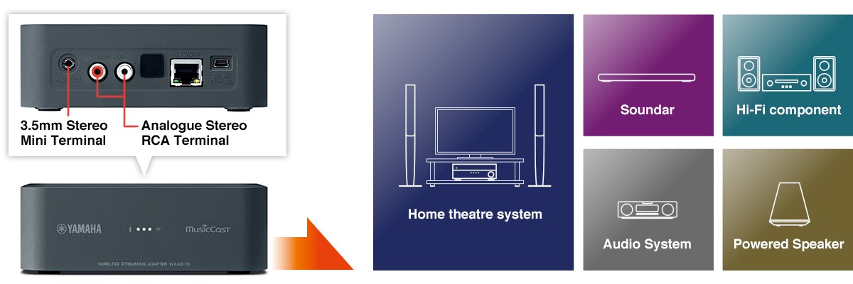 Utrustad med RCA- och mini-jack utgångar kan WXAD-10 anslutas till de flesta ljudsystem – oavsett hur gammalt eller nytt det är. Använd den med en vanlig stereo, HiFi-anläggning, hemmabiosystem eller en soundbar. Möjligheterna är oändliga