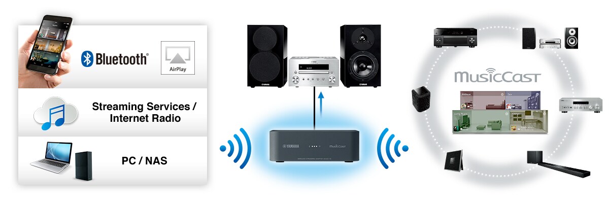 Anslut WXAD-10 till ditt nuvarande ljudsystem och få tillgång till flertalet streamingtjänster samt Bluetooth® och Airplay®. Streama musik och ljud trådlöst från din smartphone, surfplatta eller dator. WXAD-10 är också kompatibel med MusicCast, Yamahas trådlösa streamingsystem, vilket gör att du kan koppla ihop den trådlöst till andra MusicCast-enheter och fylla hela ditt hem med musik! Med WXAD-10 kan du enkelt göra ditt nuvarande ljudsystem smart och ge det alla de senaste och smidigaste funktionerna.