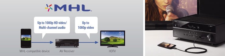 MHL ger en enkel, direkt anslutning av mobiltelefoner till receivern. Med MHL kompatibel smartphone/tablet kan du spela upp video i full HD kvalitet (1080p) och dessutom spela upp flerkanaligt ljud. Receivern laddar under tiden den anslutna telefonen. Play, stop och andra grundläggande funktioner kan styras från fjärrkontrollen.