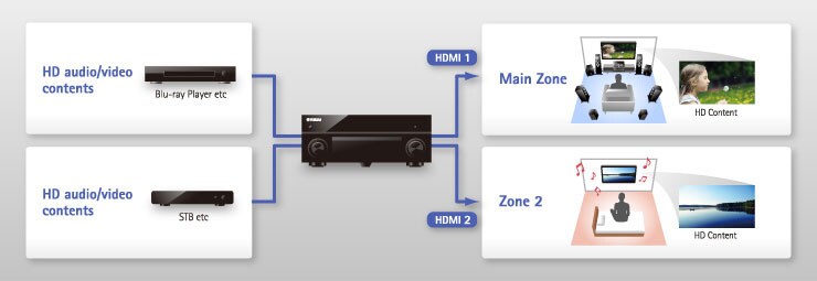 HDMI Zone switching, innebär att du individuellt kan välja och skicka HD-video program till två separata zoner. Titta på en Blu-ray Disc ™ film i Main Zone medan en HD-kabel-TV-sändning spelar i ett annat rum (zon 2).
