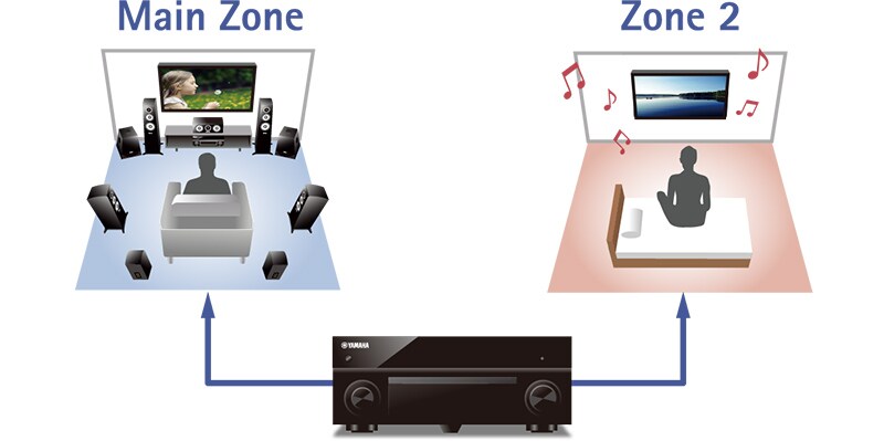 You can transmit the video or audio content to a TV or home theatre system in another room (Zone 2) via HDMI. This lets you enjoy viewing and listening to the same main room content (where the AV receiver is installed), or even different content.