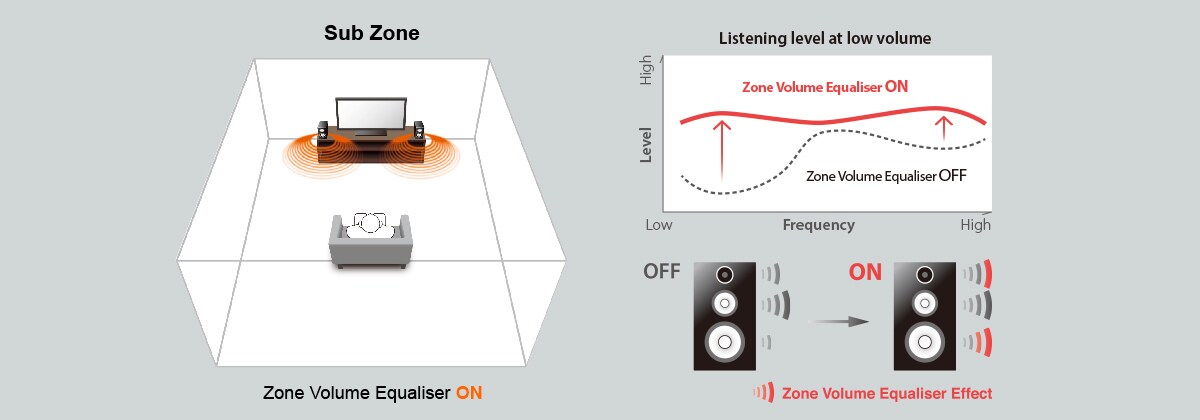 Funktionen Zone Volume Equalizer justerar automatiskt balansen mellan diskant och bas för att matcha volymen på system i ett andra rum (zon 2). Njut av filmer och musik med en naturlig ljudbalans även vid lägre volymer