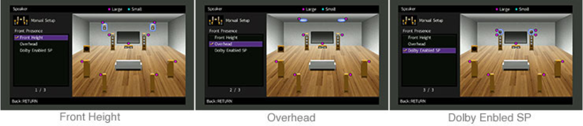 Yamaha ger flera alternativa placeringsmönster för närvarohögtalarna som stöder Dolby Atmos, vilket skapar ett ljudfält som är idealiskt för just din anläggning. Alla layouter stöder korrekt återgivning av den tredimensionella rymden skapad av CINEMA DSP såväl som Dolby Atmos.