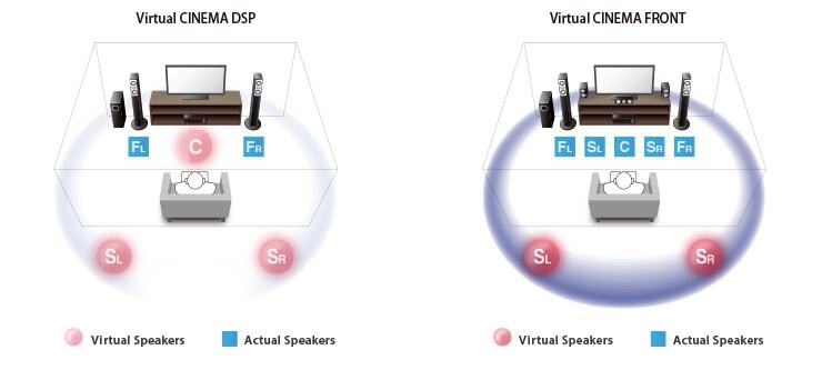 Virtual CINEMA FRONT ger surroundljud även med alla högtalarna placerade fram