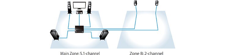 Zon B-utgång gör det möjligt för receivern att skicka två-kanaligt ljud till en andra zon. Med denna funktion kan du njuta av stereoljud i ett annat rum. Samma källa kommer att spela i båda zonerna (kan inte spela två källor samtidigt).