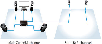 Zon B-utgången gör det möjligt för receivern att skicka två-kanaligt ljud till en andra zon. Med denna funktion kan du njuta av stereoljud i ett annat rum. Samma källa kommer att spela i båda zonerna (kan inte spela två källor samtidigt på samma sätt som Zon 2).