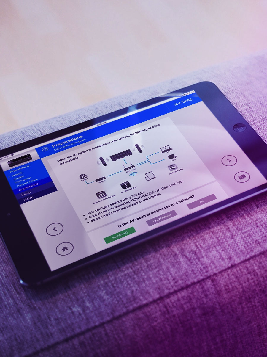 Inga bekymmer, inget trassel. Använd denna speciella app för att få experthjälp med kabelanslutningarna mellan AV-receivern och uppspelningsenheter. Den vägleder dig också genom andra inställningar, som högtalaranslutningar, anslutning av TV, andra uppspelningsenheter samt hur du vill konfigurera ditt system.