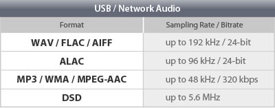 • DSD 2.8 MHz / 5.6 MHz, FLAC / WAV / AIFF 192 kHz / 24-bit, Apple® Lossless 96 kHz / 24-bit playback