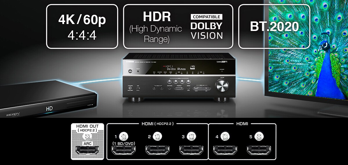 • HDMI® (6 in / 1 out) with 4K Ultra HD full support, HDR Video including Dolby Vision and Hybrid Log-Gamma, and BT.2020