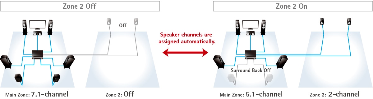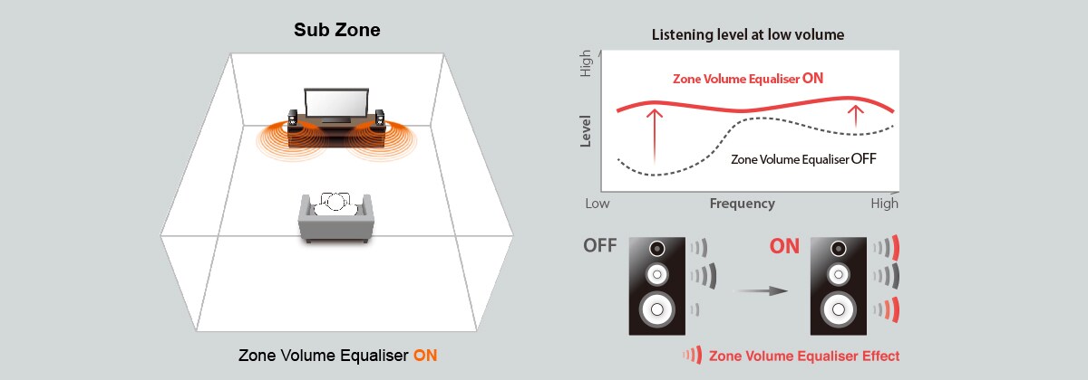 Automatically adjusts bass and treble balance to match the volume on system in other rooms (Zone 2). Enjoy movies and music with a natural sound quality balance even at low volumes.