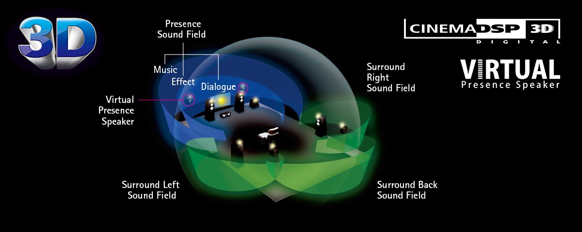 CINEMA DSP 3D provides a wide, high and dense sound field. HD Audio format decoding lets you enjoy HD Audio sources. Virtual Presence Speaker delivers 3-dimensional sound without actual use of presence speakers.