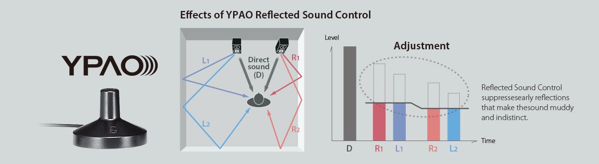 YPAO-R.S.C. analyses room acoustics and measures various speaker characteristics, then calibrates audio parameters to achieve optimum sound. It employs Reflected Sound Control to correct early reflections for studio-quality sound. It also provides DSP Effect Normalisation, which varies the CINEMA DSP parameters according to the reflected sounds.