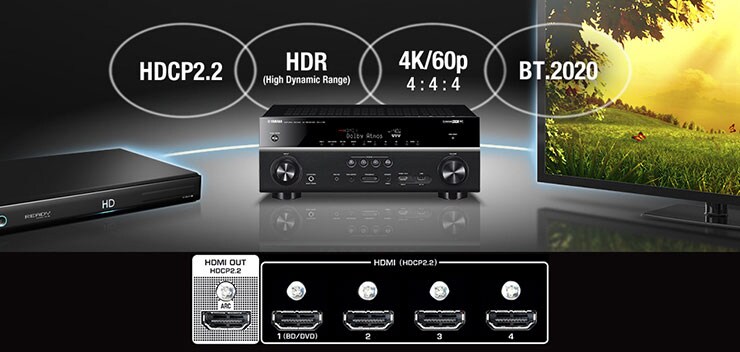 Denna receiver har fullt stöd för den senaste HDMI® standarden. 4K video överföring med 60 bilder per sekund kan du njuta fullt ut av högupplöst videokvalitet i 4K utan försämring. Den stödjer också HDCP 2,2 som är en standard för upphovsrättsskydd för 4K video. Stöd för HDR (High Dynamic Range) Video som ger förbättrad bildkvalitet genom att visa mer detaljer i både mörka och ljusa delar av bilden. Vidare stöds en större färgskala, BT.2020.
