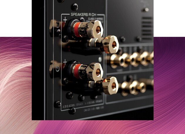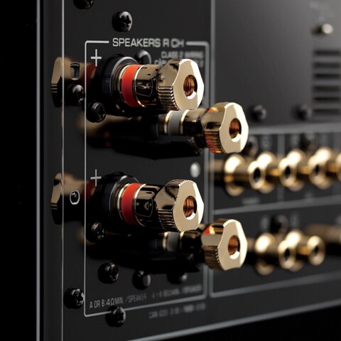De lyxiga högtalarterminalerna är skurna direkt ur ren mässing och passar perfekt i handen så att du lätt kan dra åt dem och få en säker anslutning.