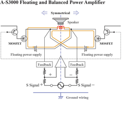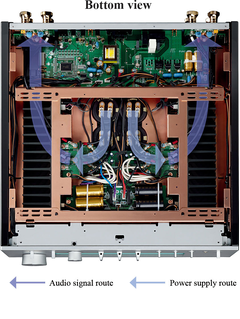 Förstärkarkretsen är separerad både fysiskt och elektriskt från slutstegen och är placerade i perfekt vänster-höger symmetri. Genom att separera pre amp, som hanterar svaga signaler, från slutsteg som hanterar förstärkta signaler med hög energi minskas ljud försämring som kan orsakas av störningar mellan dessa. Dessutom säkerställer vänster-höger symmetrisk design som håller vänster och höger effektsteg helt separat, större kanalseparation och förbättrar ljudet i stereobilden. Det ger helt enkelt ett renare ljud och ett musikaliskt resultat.