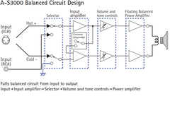 A-S3000 har en helt balanserad signalöverföring. Även förstegets funktionskretsar (volym, tone, etc.) har helt balanserad drift, perfekt överföring genom alla steg.