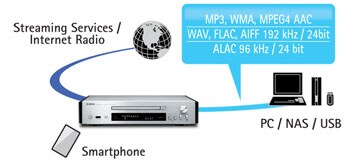 CD-spelaren är utrustad nätverk som gör att du smidigt kommer åt ett enormt utbud av musik: allt från streamingtjänster och internetradio till NAS (Network HDD) eller ditt musikbibliotek på datorn eller mobilen. Med internetradion vTuner- kommer du åt radiostationer från hela världen. Du kan söka på olika genrer och även lägga till dina favoriter som Presets, så du enkelt hittar tillbaka nästa gång du vill lyssna…precis som om du lyssnade på DAB och FM-sändning. Det finns även stöd för uppspelning av högupplösta WAV / FLAC / AIFF 192kHz / 24-bit musik filer. Dessutom har den en USB-port på frontpanelen för anslutning av portabla spelare eller USB-minnen. Du kan även streama trådlöst via AirPlay eller Bluetooth.