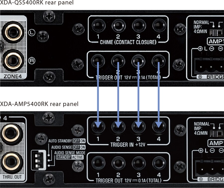 Allt du behöver göra när en QS och förstärkare används tillsammans är att ställa in triggerportarna så att de automatiskt slår på/stänger av de önskade förstärkarzonerna – inga andra styrgränssnitt behövs. Förstärkaren fungerar också bra tillsammans med en AVENTAGE AV-receiver. När förstärkaren används tillsammans med andra källor blir kontrollen extra flexibel tack vare ljudavkännande ingångar och en infraröd I/O.