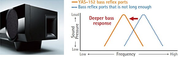 The YAS-152 is a wide sound bar that matches 55 to 60 inch large screen TVs. Its integrated body is equipped with two 6.5 cm (2-1/2”) speakers, two 8.5 cm (3-1/2”) subwoofers, and a digital amp with 120 W total output. The speaker and subwoofer units are separated to the left and right sides, for sound with breadth and superior imaging suitable for a large screen. The wide shape and superior sound bar design achieve larger cabinet capacity, letting you enjoy TV sound with richly powerful bass.