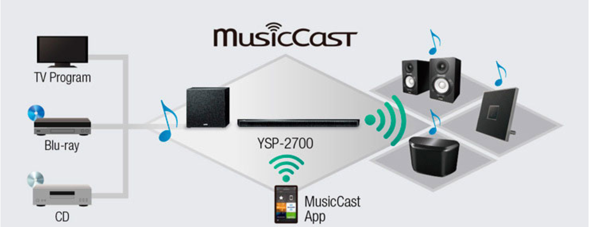 MusicCast kan spela din musik trådlöst till en eller flera olika enheter. Du kan även skicka ljudet från en Blu-ray eller CD-spelare som är ansluten till en MusicCast produkt till en annan MusicCast högtalare. – All musik blir tillgänglig i alla rum i huset. Om du har musik lagrad på en PC eller NAS kan du via DLNA spela upp den musiken också, allt som krävs är att de är anslutna till samma nätverk. Du kan även dela ut extern inkopplade ljudkällor som TV eller BD-spelare. Ljud du skickar till YSP-2700 med bluetooth kan också skickas vidare till en annan MusicCast enhet i ett annat rum.