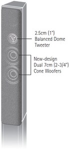 Just 90mm (3-1/2") wide, and with round stands, the front speakers are easy to position in any room. The curvilinear form has the elegant beauty of a fine musical instrument and will add a smart touch to the interior.