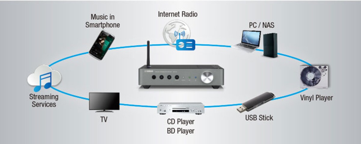 - Anslut till förstärkare utan MusicCast så får du multiroom och streamingsfunktioner