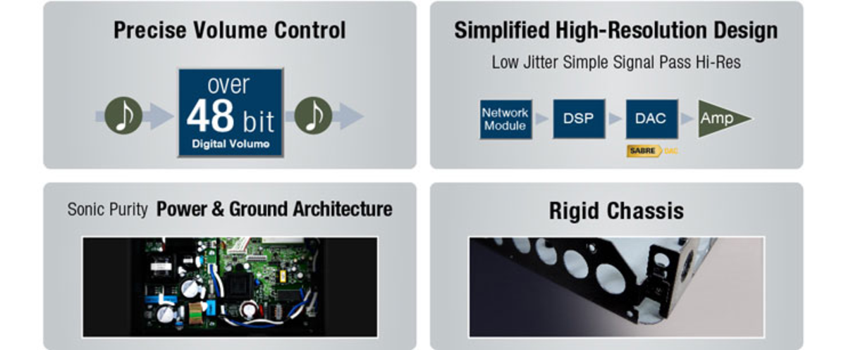 WXC-50 utnyttjar alla fördelarna med Yamahas avancerade ljudtekniker och kretskonstruktioner. Förförstärkarkretsen till exempel minimerar digitalt jitter och använder samma höga prestanda ESS DAC som finns i våra High-End receivers. Yamahas egen konfiguration, kallad DAC on pure Ground, ser till att strömförsörjningen aldrig kommer att påverka ljudkvaliteten negativt. En 48-bitars digital volymkontroll den ger mycket större precision och kvalitet än konventionella digitala eller analoga kontroller. Dessutom har WXC-50 ett mycket styvt metallchassi som ger den stabilitet som krävs för kraftfull och tydlig ljudåtergivning.
