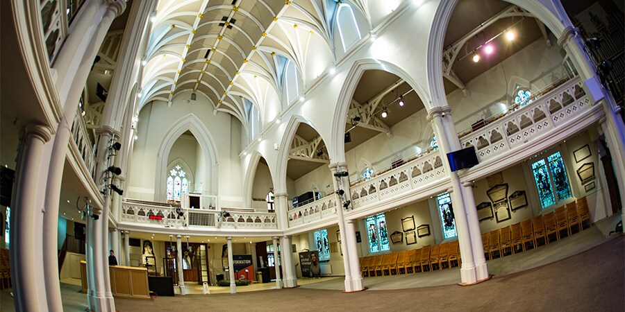 HTB has four sites in London, its Brompton Road complex being close to popular destinations like the Science, Natural History and V&A museums. Here the church has a primary worship space, as well as a number of smaller ‘breakout’ rooms where meetings and other events can be held. These are located several hundred metres from the main building.