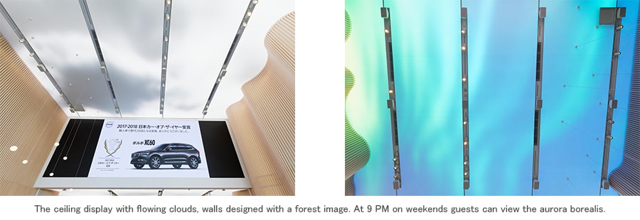Volvo Studio Aoyama is based on a design concept that is completely different from standard Volvo showrooms. The ceiling, walls, and floor are all designed to reflect Sweden’s natural environment. The ceiling is a display panel that shows blue sky and drifting clouds. On weekends, at around 9 PM during “bar time,” the ceiling comes alive with aurora borealis. The walls are composed of natural wood poles arranged to create a forest atmosphere. The floor is a special material that has been designed to resemble a rocky reef. The Volvo head office is in Göteborg, the second-largest city in Sweden, located on the country’s west coast. Our floor is designed to resemble the local reef.