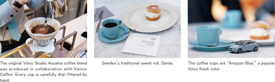 The fact that Volvo Studio Aoyama includes a café and bar also separates it from standard car showrooms. The café operates until 6 PM, and then it becomes a champagne bar. The café serves coffee produced in collaboration with Kanno Coffee that has been carefully blended to suit Japanese taste. We also serve traditional Swedish “semla” sweet rolls.