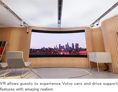 We can only display two cars at a time in this space, so the virtual reality system with its VR goggles and headphones is very useful. Customers can see how the cars look in other colors, sit inside and drive the cars, and even have some surprising experiences that demonstrate safety features. The car might stop automatically when moose suddenly runs in front of it, for example. Innovation is also an important part of the Volvo philosophy, as exemplified by the many digital devices available here at the Volvo Studio.