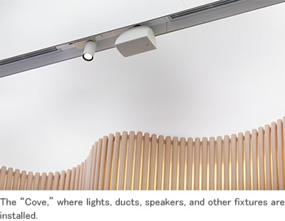 The Volvo plan specified electrical fixtures, lights, ducts, speakers, and anything else to be hidden in the grooves they referred to as the “Cove,” in order not to block the ceiling display panel. But the speakers from a different manufacturer that had been originally specified by Volvo did not fit in the Coves when they were laid out with emergency equipment required by Japanese fire law. At that point discussions with the Volvo head office let to the adoption of Yamaha VXS5W speakers.