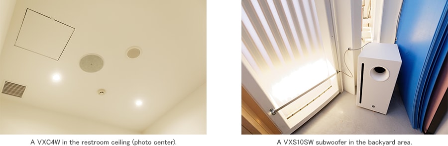 A total of 21 Yamaha VXS5W speakers are installed in the ceiling, assigned to three zones: entrance, a row in front of the video monitor, and the rear area. This allows optimum volume to be set for each zone. The speakers in front of the large monitor deliver sound for video content shown, while the others handle background music. Two VXS10SW subwoofers are also installed in locations that are not visible to guests. Five VXC4W ceiling speakers are installed in the office and restroom.