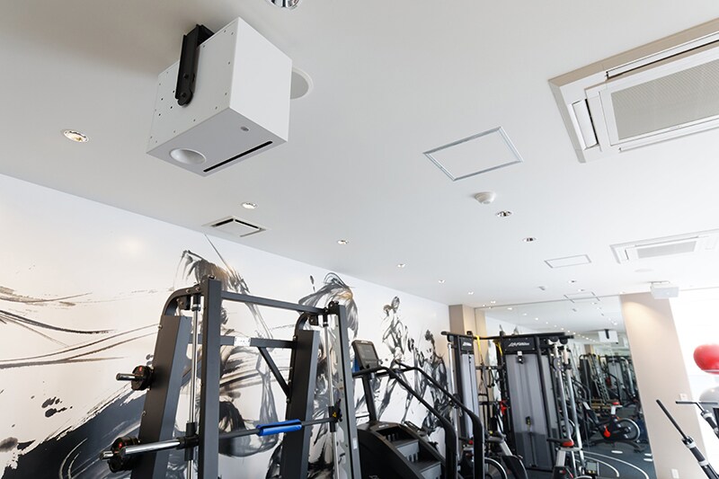 I am convinced that as your pulse rises when you exercise, feeling a low-frequency beat with your body can provide a subtle boost in motivation. We were already determined to approach music playback seriously at Fit&Go, so we decided to include a subwoofer that would enhance the interplay between the music and fitness. There wasn’t much space available in the gym area, so we suspended the subwoofer from the ceiling. That has turned out very well.