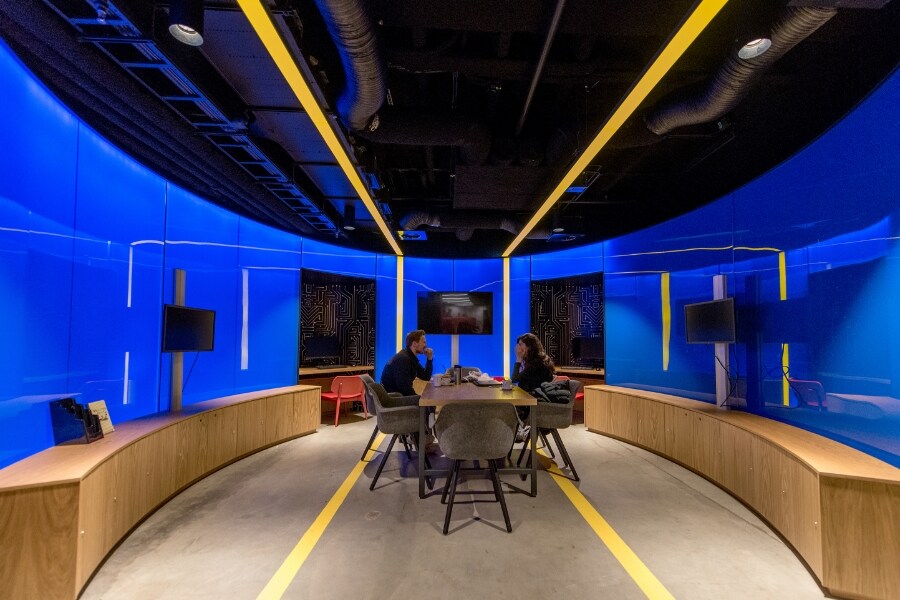 In De Stemmingmakerij, a room for meetings and AV presentations, four Yamaha VXS8 full-range, surface-mount speakers are installed as a stereo system, arranged to seamlessly cover the room, which is wider than it is deep. Powered by an XMV4180 multi-channel amplifier and managed by an MTX3 matrix processor, when a microphone is used the two middle speakers are automatically lowered in volume, maximising gain before feedback.