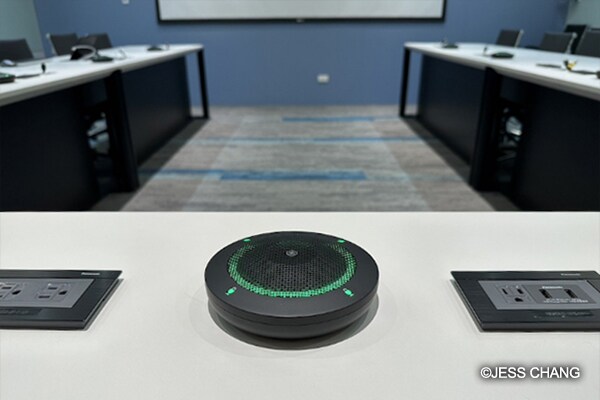 An RM-CG ceiling array microphone is installed in the video conference room for senior executives. The Dante-compatible unit is equipped with a four way auto-tracking beamforming array and unique digital signal processing (DSP) technologies. These allow it to automatically detect who is speaking and pick up the sound from that area, while reducing unwanted noise from other areas, such as papers and cups being moved.