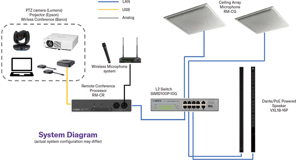 Two ADECIA systems were installed - one in each room - each comprising two RM-CG ceiling array microphones, an RM-CR remote conference processor and VXL1B-16P slimline Dante PoE powered speakers - four in the larger room, two in the smaller room. The signal from a handheld wireless microphone system was routed to the RM-CR, which is connected to a Barco ClickShare wireless video conferencing system host via USB.
