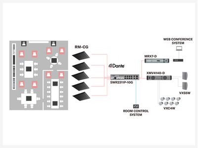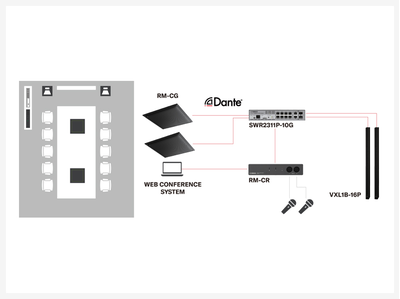 VXL1-16P Dante Speakers deliver clear sound reproduction. The system easily integrates with UC platforms. The RM-CR conference processor takes care of all the audio routing automatically.
