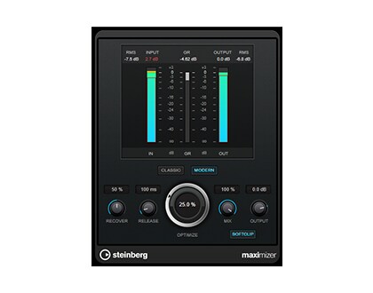 Maximizer raises the loudness of audio material without the risk of clipping. The plug-in provides two modes, Classic and Modern, that offer different algorithms and parameters.