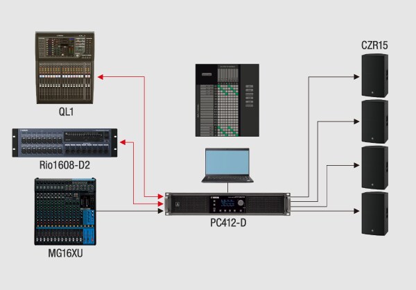 Sound is fed from Dante inputs on two devices to a PC412-DI. Input matrix functionality is used to direct the combined sound to speakers. Additionally, Dante Out can be used to send sound with adjusted EQ to other amlifiers.