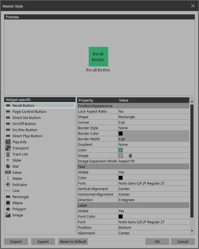 This allows you to define and specify the widget design in order to efficiently create them in accordance with your own style. A style you specify can be saved as a file, and then shared with other instances of ProVisionaire Control.