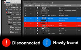 You can take a “snapshot” of the network status when set up as required. The software can then automatically keep track of the settings and alert you to any changes. You could take a snapshot of the network during rehearsal, and then you’d be alerted if a cable is disconnected, if a device is turned off, or if a wrong connection is made prior to the performance, for example.