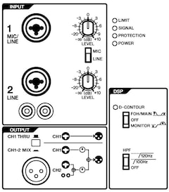 DBR Series speakers have two input channels. CH1 has a combo jack which accepts both XLR and TRS Phone allowing for either Mic or Line level input signals. CH2 offers two input options; a combo jack that accepts XLR or TRS Phone, and an RCA pin jack for input from CD players or other stereo line-level sources. The onboard mixer allows you to select either CH1+2 MIX to mix the signal of CH1 and CH2, or CH1 THRU to pass the signal from CH1 only.