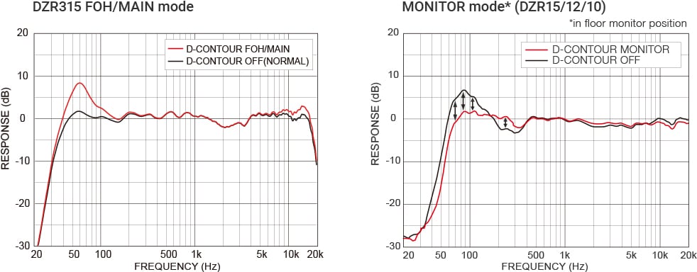 A perfect complement to the DZR’s versatile cabinet design, D-CONTOUR provides two different settings, FOH/MAIN or MONITOR mode, offering more detailed tuning of your sound relative to your PA’s configuration. FOH/MAIN mode boosts the lower frequencies to compensate for low end that is typically missing when speakers are used in suspended applications or mounted on a speaker stand. MONITOR mode is optimized for floor monitoring application by taming down problematic low frequencies that can be enhanced by floor reflection, and smoothing a wide range of frequencies to deliver the clarity professionals demand from their stage monitors. Both of these presets were perfected by performing countless listening tests with skilled sound engineers to ensure consistent sound with low distortion at any output level.