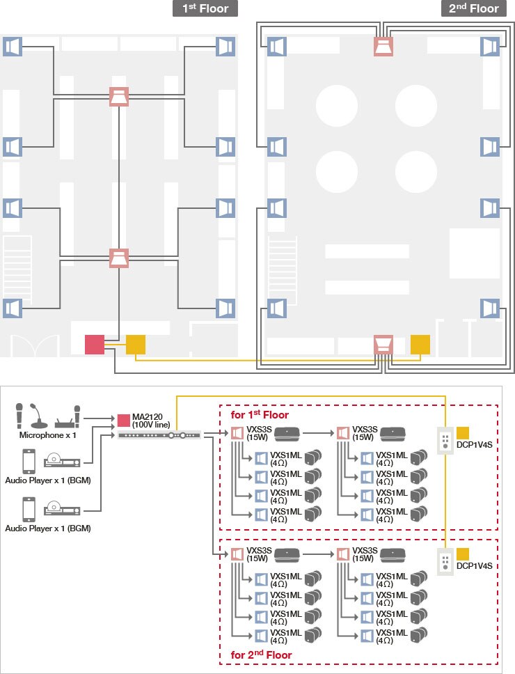 This is a system that connected VXS3S with high impedance and constructed multiple satellites. You can easily change the required volume by switching the output W number by tapping. The MA2120 can deliver different sources at different volumes in the respective zone.