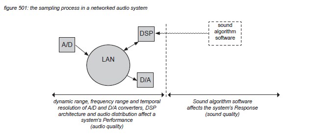 All networked audio systems use A/D converters to transform analogue audio signals to the digital domain through the sampling process, and D/A converters to transform samples back to the analogue domain. Assuming that all A/D and D/A converters, and the distribution of the samples through the digital audio system, are linear, sampling does not affect the Response of a digital audio system - all A/D and D/A processes and distribution methods sound the same. (only intended changes - eg. sound algorithm software installed on a system’s DSP’s - affect the sound). Instead, sampling and distribution can be seen as a potential limitation as it affects audio signals within the three audio dimensions: level, frequency and time. This chapter presents the sampling process limitations to a system’s Performance: dynamic range, frequency range and temporal resolution.