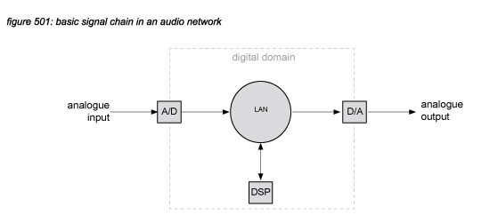 A basic signal chain from analogue line input to line output in a networked audio system consists of an A/D converter, a distribution network (LAN), a DSP unit and a D/A converter: