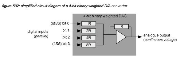 D/A converter circuits basically consist of one or more highly accurate switched current sources producing an analogue output current as a result of a digital input code. To illustrate the basic concept of a D/A converter, an example of a simple 4-bit binary weighed D/A converter is presented in figure 502. The circuit uses individual resistors for each bit, connected to a summing point. Commonly available D/A converters use more complex high speed techniques such as delta-sigma modulation(*5J).