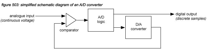 A/D converters are slightly more complex, using an AD logic component driving a D/A converter. The output of the D/A converter is compared to an analogue input, with the result (higher or lower) driving the AD logic component.