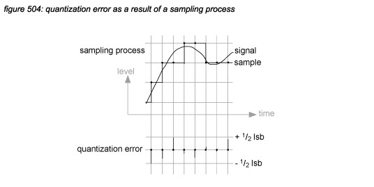 The level of the quantization error in an A/D converter depends on the sample rate, the bit depth and the sampled waveform. The quantization error in a DSP process depends also on the number of steps. As D/A converters are assumed to reproduce the digital representation of the signal - and not the original signal, they do not generate quantization errors. However, a D/A converter can never reach a higher resolution than 1 LSB. Figure 504 illustrates an A/D converter’s quantization error.